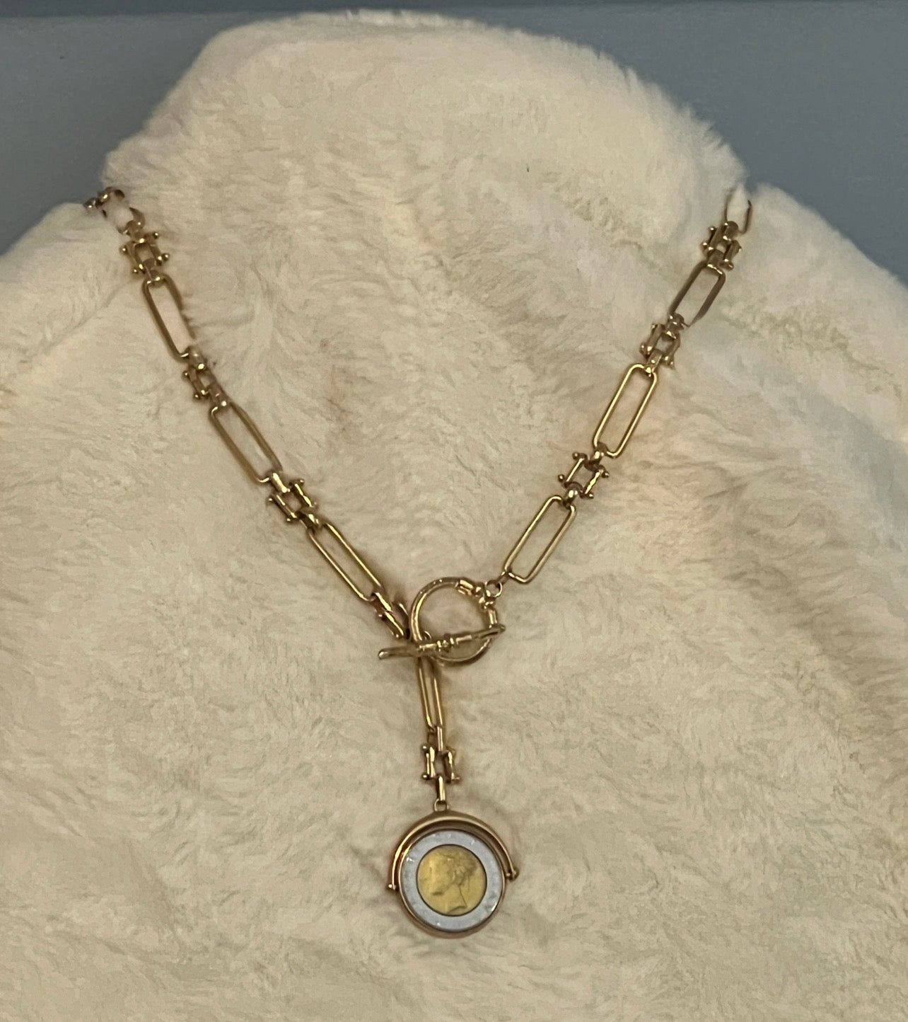 Pendant hangs comfortably off a gold overlay chain necklace.