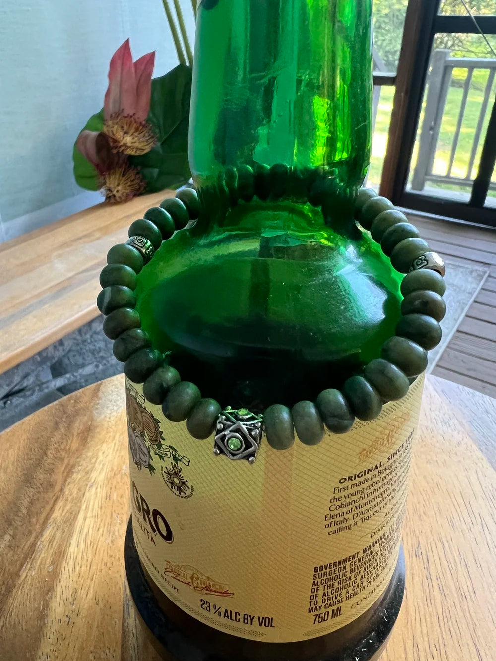 Olivine Green Jade smooth rondelle matte finish with green charm. Bracelet 8.5 inches