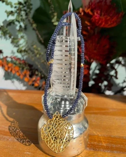 Inspired by the azure Gulf waters and the city's omnipresent gold, I crafted the blue faceted beads fashioned with a delicate gold filigree pendant.