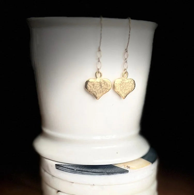 Thick hammered gold heart with gold hammered ear wire on chain.