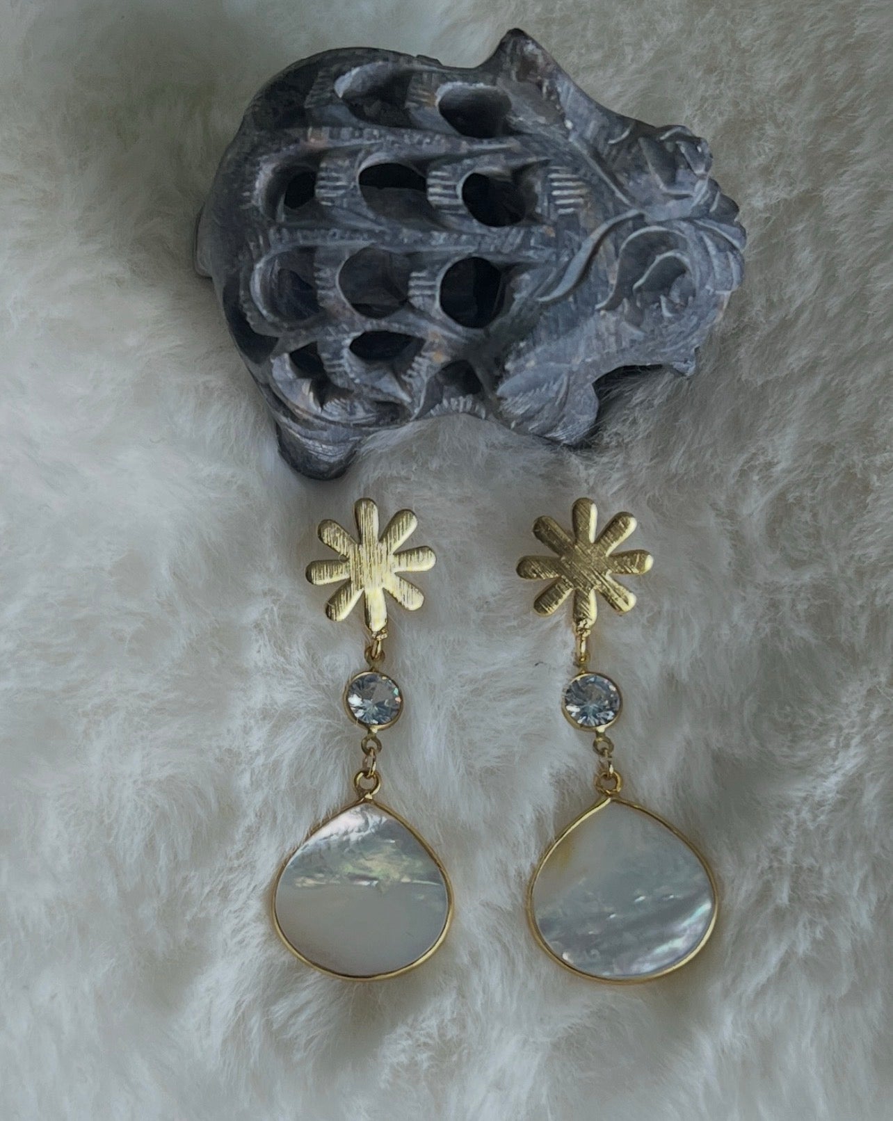 Mom of pearl, crystal connector and brushed gold backing