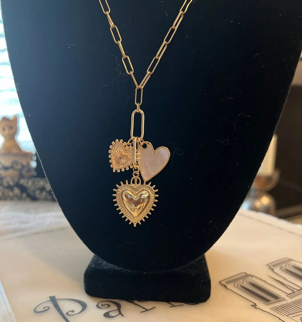 One mother-of-pearl - two gold hearts on gold over brass chain